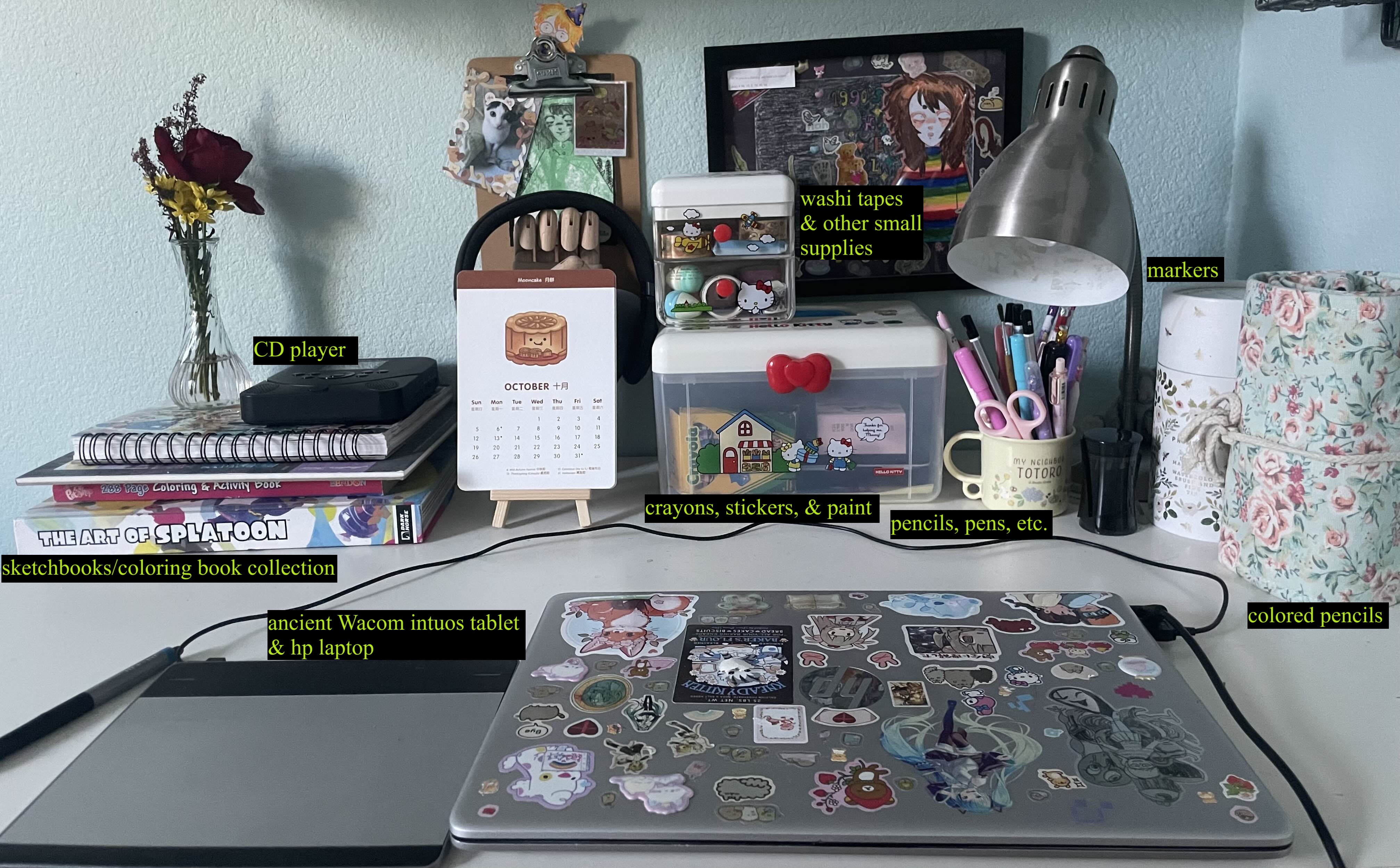 Most of my art is produced digitally in Microsoft Paint. On the rare occasion I want to create art the old-fashioned way, I use watercolor paints, crayons, & colored pencils.