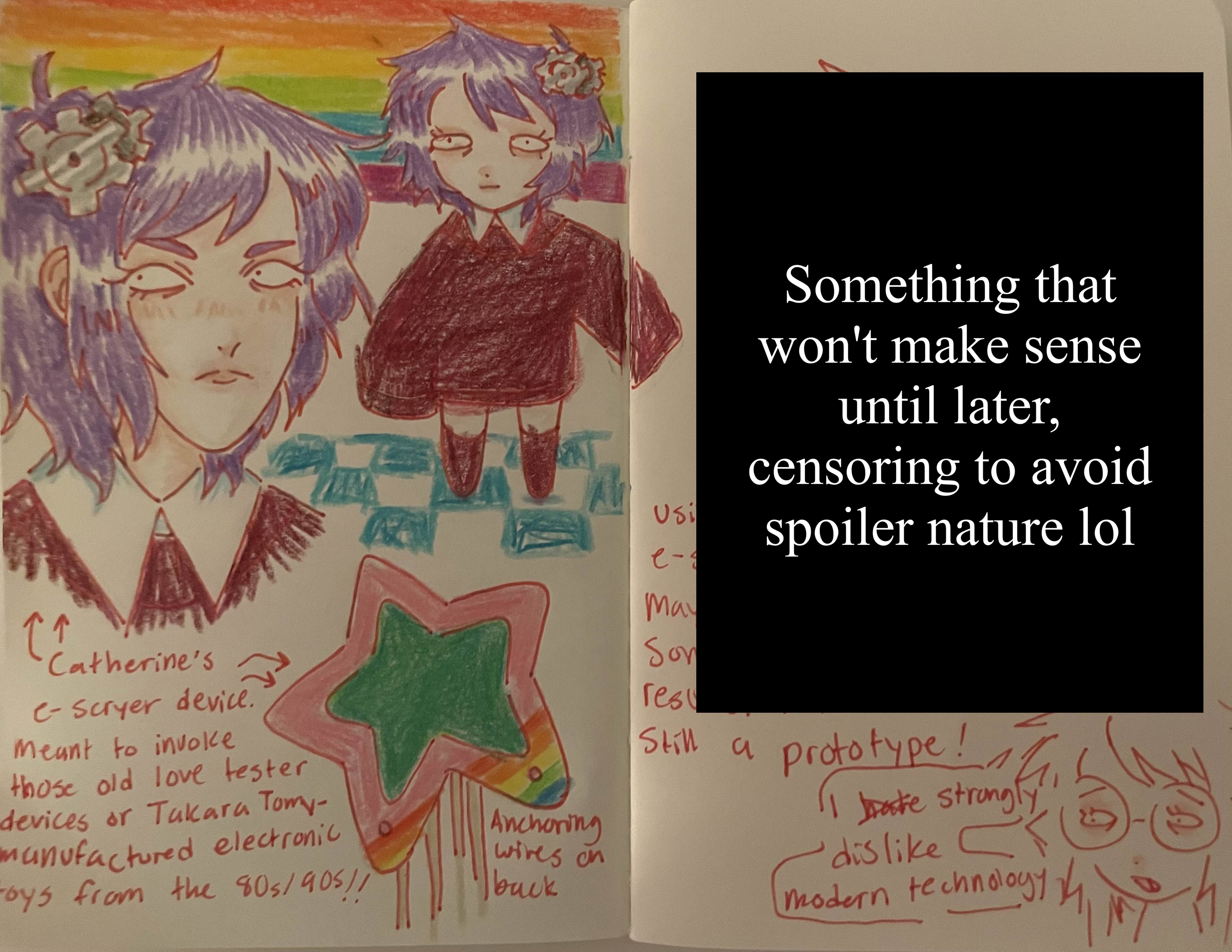 I'm honestly a bit tempted to create a separate page in the 'PROJECTS' section of the art gallery where I upload the contents of this journal... Maybe once I've finished writing all the stories? A lot of the things I've drawn and written in here will only make sense to me right now, and of course there's lots of spoilers for future volumes considering that I'm drawing and writing about events that haven't been published here yet.